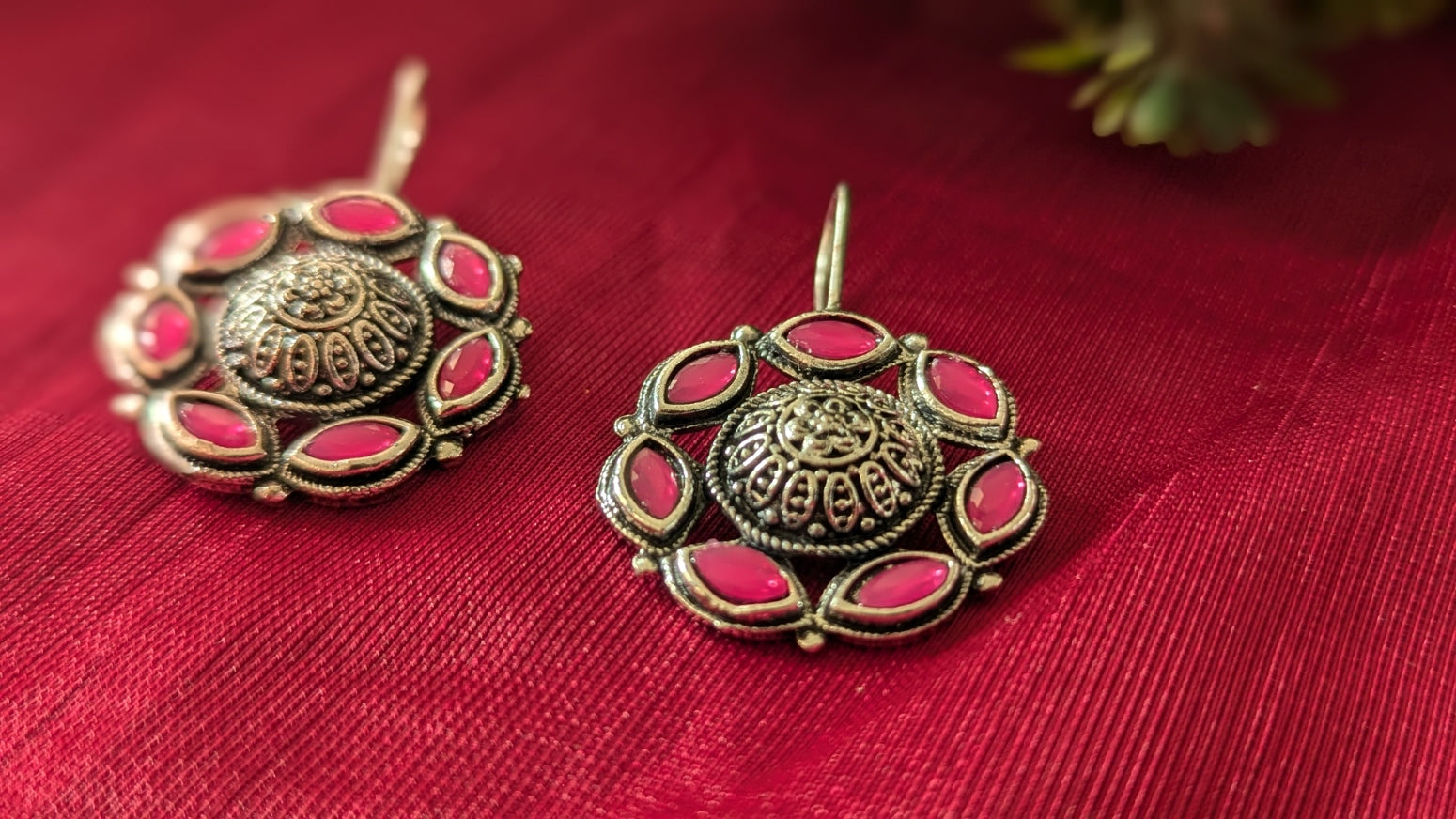 सिल्वर ऑक्सीडाइज़्ड पिंक फ्लावर हुक इयररिंग्स