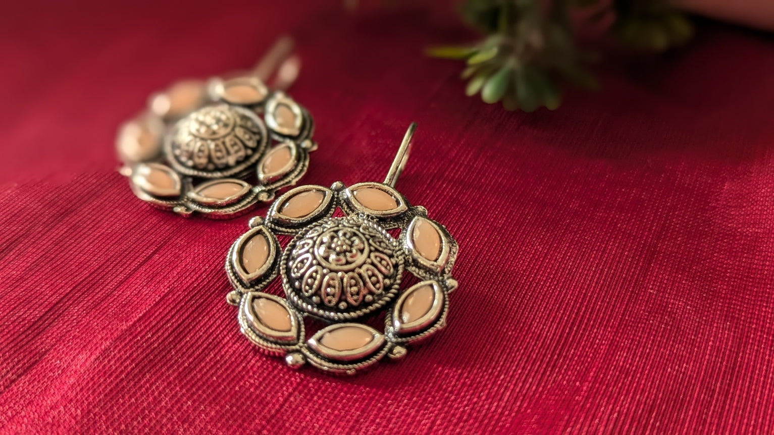 सिल्वर ऑक्सीडाइज़्ड पीच स्टोन्स लॉन्ग हुक इयररिंग्स