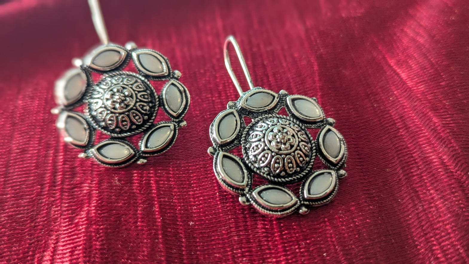 सिल्वर ऑक्सीडाइज़्ड व्हाइट स्टोन राजस्थानी फिश हुक स्टड इयररिंग