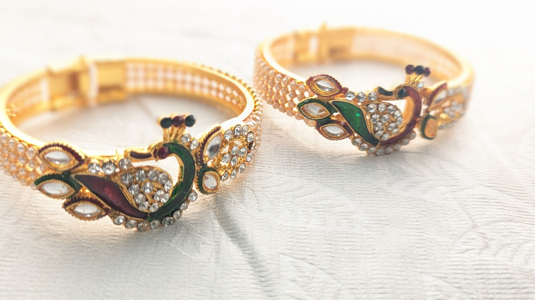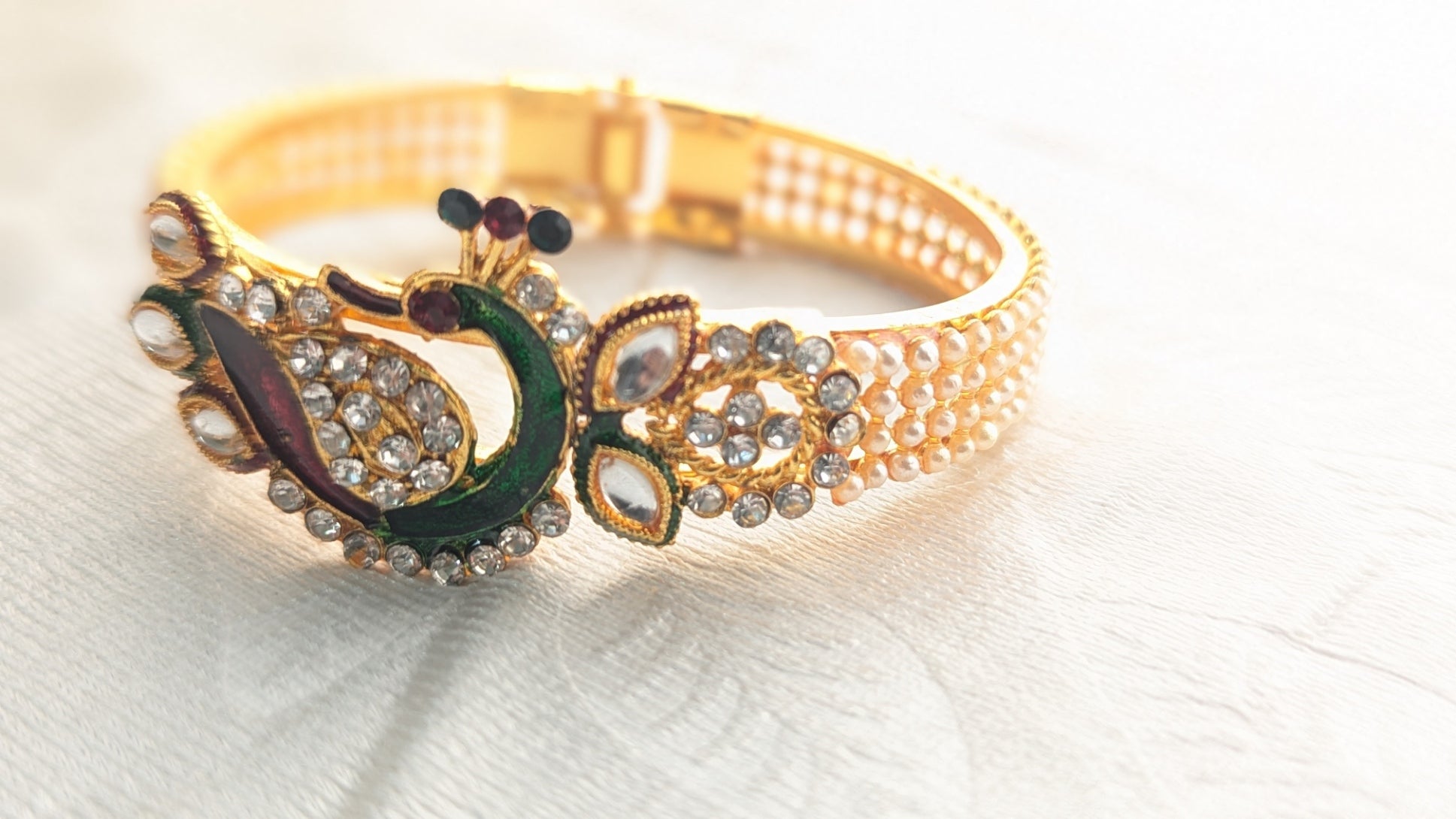 - Studded with Kundan stones, diamonds, and faux pearls