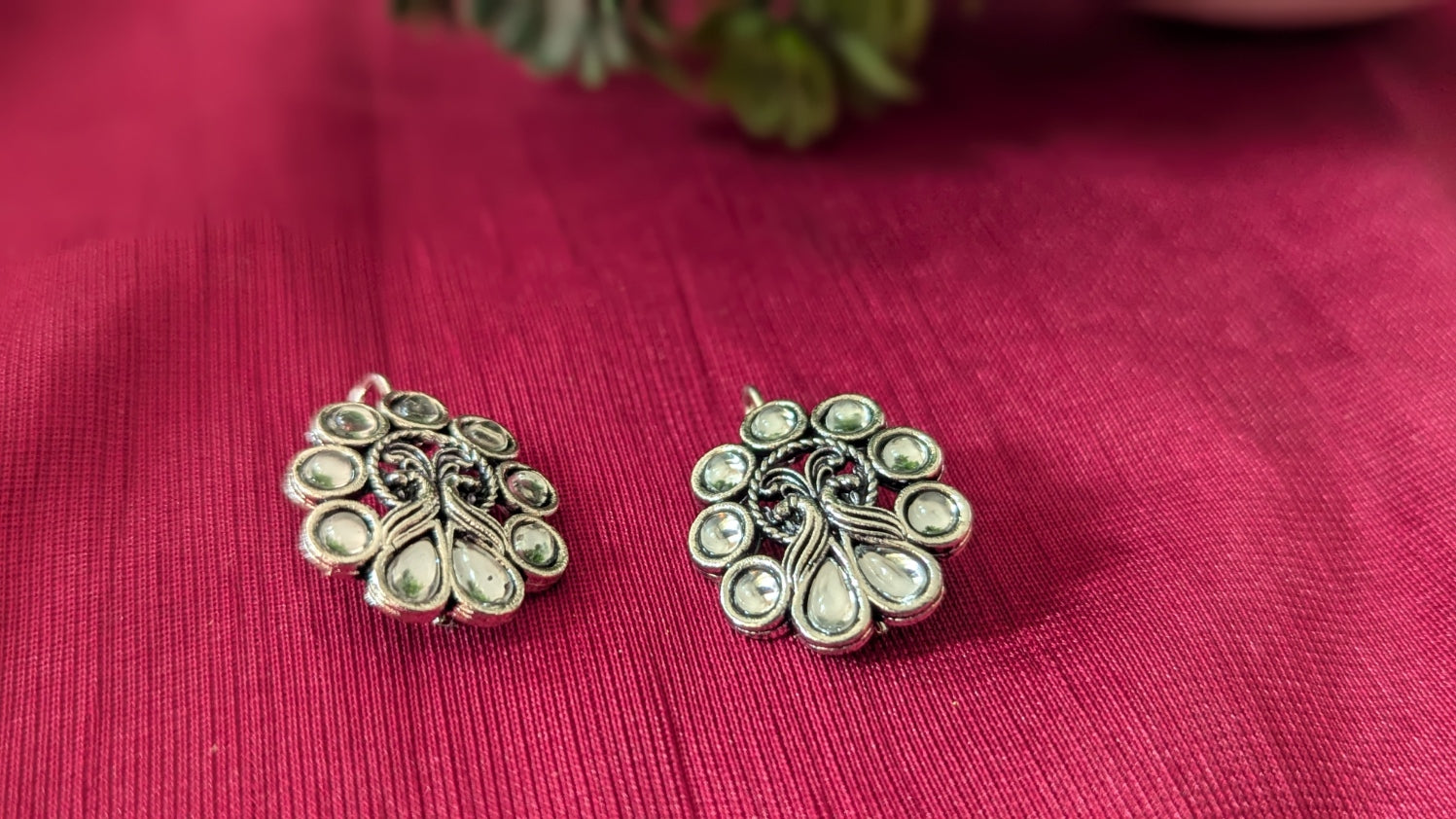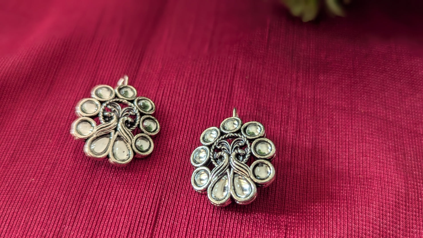 Silver Oxidized White Stone Rajasthani Fish Hook Stud Earring